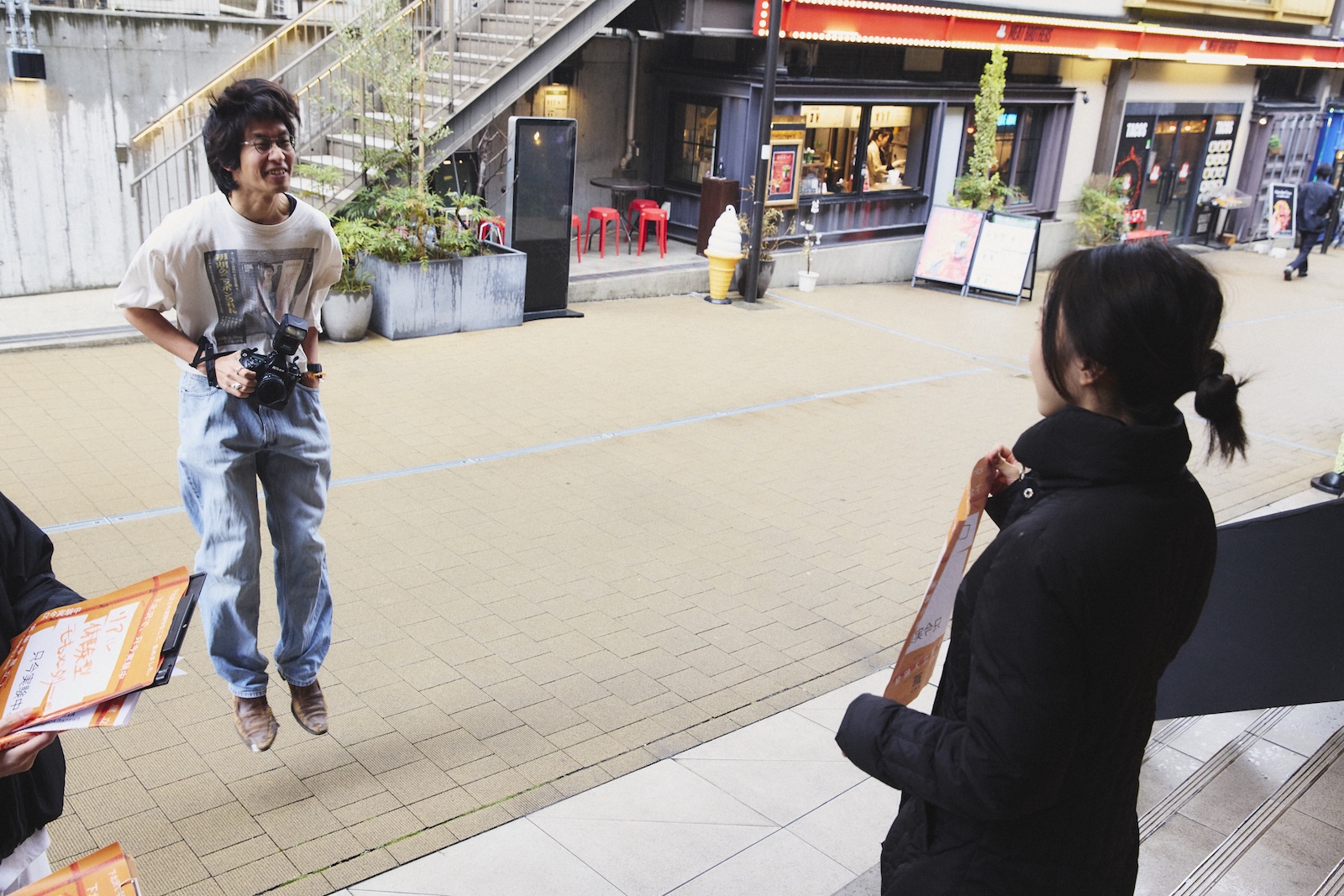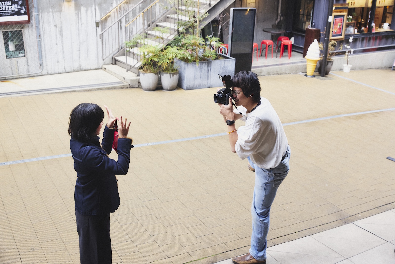 さらに初日には、ミカン下北がこれまで行ってきた「下北沢で働く価値を高める」実験の一環として、下北沢で働く人に向けた公開スナップ撮影会「Photo at SHIMOKITA-Working in Shimokitazawa」を実施。撮影を担当したのは、いま最も注目したい写真家の一人、是永日和さんだ。まるで映画のワンシーンを切り取ったような、物語を想起させる写真で人気を博す是永さんは、実は下北沢との縁が深く、「僕は下北で育ったと言っても過言じゃないです」とも話す。そんな是永さんの撮影会は、まずミカン下北「オブジェ前」「ダンダン」からスタートした。