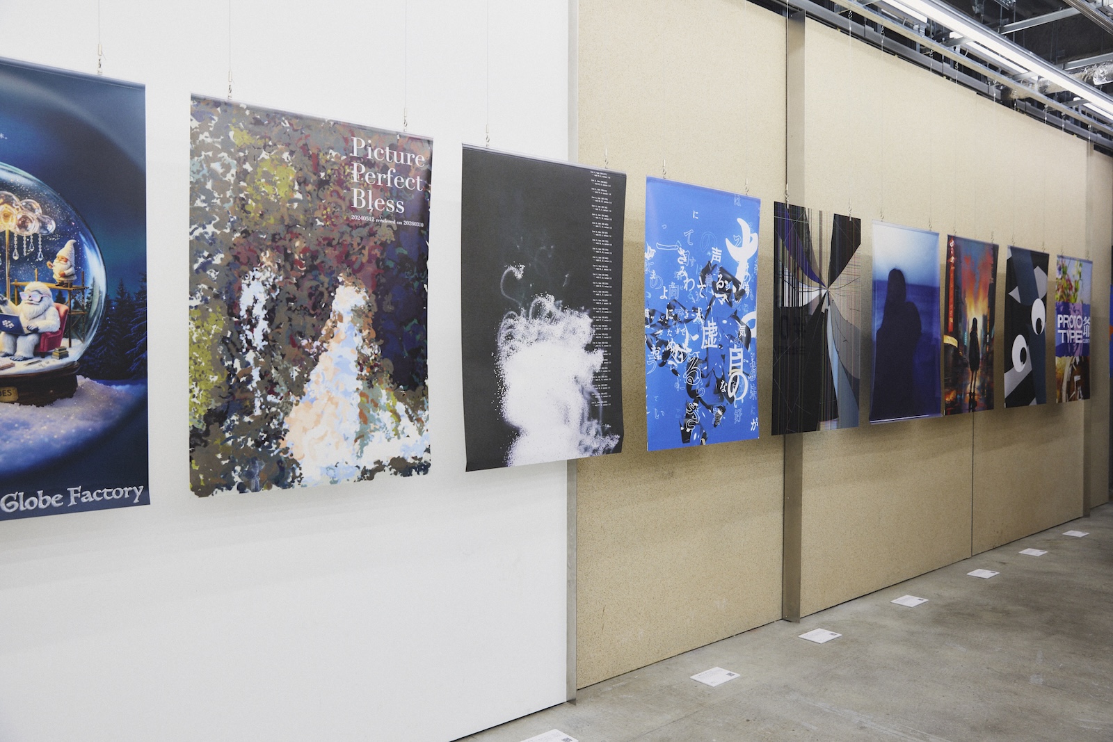 展示されたのは、三社から自主的に手を挙げた20名超のクリエイターの作品群。ルールは「B1のポスター」ということのみで、テーマ設定や創り方は自由。そこには、AIを駆使した作品から、地元の和紙を使用した作品、アクリルを使った作品など、それぞれがそれぞれの思いを具現化した、熱のこもった作品群が並べられた。