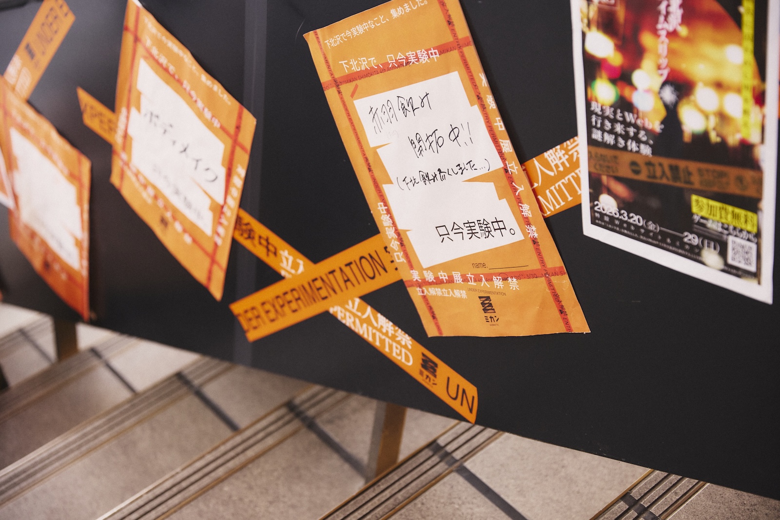 ダンダンに装飾された「UNDER EXPERIMENTATION 実験中」テープ。ミカン下北の通路やお店の前まで、ミカン下北を手がける京王電鉄や店舗スタッフなどさまざまな方が参加しながら、連日実験を楽しむ様子が見られた。